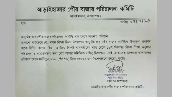 রোববার (১৪ ডিসেম্বর) বাজার পরিচালনা কমিটির প্যাডে কমিটির সাধারণ সম্পাদক স্বাক্ষরিত একটি নোটিশে বলা হয়, “মহান বিজয় দিবস উপলক্ষে আড়াইহাজার পৌর বাজার কমিটিকে উপজেলা প্রশাসন থেকে বিভিন্ন ব্যাংক, বীমা ও এনজিওভিত্তিক ব্যবসায়ীদের কাছ থেকে ১৬ ডিসেম্বর বিজয় দিবসের অনুষ্ঠান পরিচালনা ও সহযোগিতার জন্য দায়িত্ব দেওয়া হয়েছে। সে অনুযায়ী প্রত্যেক প্রতিষ্ঠান থেকে সর্বনিম্ন ৫০০ টাকা দেওয়ার জন্য বিশেষভাবে অনুরোধ করা হচ্ছে।”