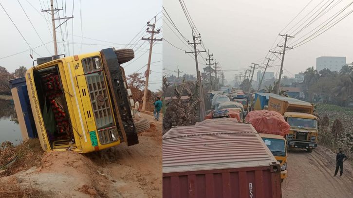 নারায়ণগঞ্জের বন্দর উপজেলার মদনগঞ্জ-মদনপুর সড়কে একটি সিমেন্টবোঝাই ট্রাকের চাকা গেঁথে যাওয়ার ঘটনায় প্রায় ১৮ ঘণ্টা ভারী যান চলাচল বন্ধ ছিল। এতে চরম ভোগান্তিতে পড়েন দূরপাল্লার চালক ও স্থানীয় বাসিন্দারা।