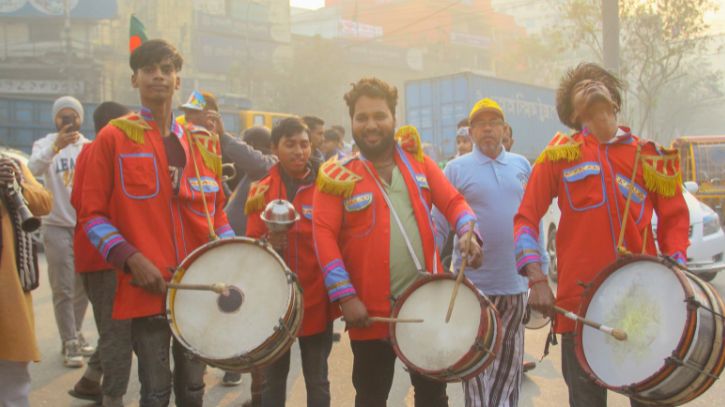 উৎসবমুখর পরিবেশে বিজয় উদযাপনে মেতেছে ব্যান্ড দলের সদস্যরা।