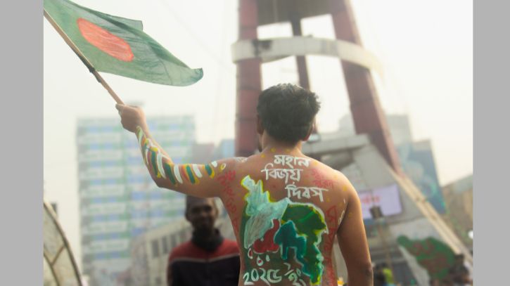 শরীরে মানচিত্র এঁকে হাতে দেশের পতাকা উঁচিয়ে বিজয় স্তম্ভের সামনে এক যুবক।