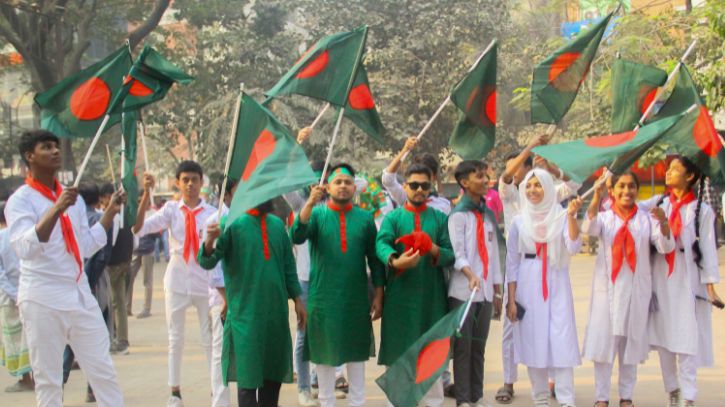 জাতীয় পতাকা হাতে উচ্ছ্বসিত একদল শিক্ষার্থী।