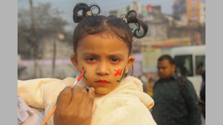 গালে রঙিন নকশা আঁকিয়ে নিচ্ছে শিশুটি।