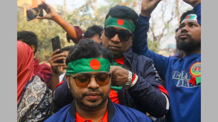 মাথায় জাতীয় পতাকা বেঁধে নিচ্ছেন এই যুবক।