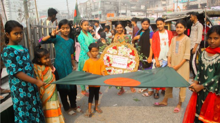 সূর্যোদয়ের সঙ্গে সঙ্গে ৩১ বার তোপধ্বনিসহ নানা আয়োজনের মধ্য দিয়ে নারায়ণগঞ্জে উদযাপিত হয়েছে মহান বিজয় দিবস। দিবসটি উপলক্ষে শহরের চাষাঢ়া এলাকায় ‘বিজয় স্তম্ভে’ হাজারো মানুষের ঢল নামে জাতির শ্রেষ্ঠ সন্তানদের প্রতি শ্রদ্ধা জানাতে। অভিভাবকদের সঙ্গে বর্ণিল সাজে শিশুরাও বিজয় দিবসের আনন্দে অংশ নেয়।
