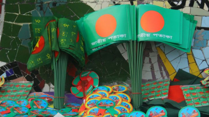 পতাকাসহ বিভিন্ন সামগ্রী বিক্রির জন্য সাজিয়ে রেখেছেন বিক্রেতা।