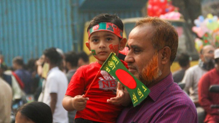 বর্ণিল সাজে হাতে পতাকা নিয়ে অভিভাবকের সাথে শিশু।