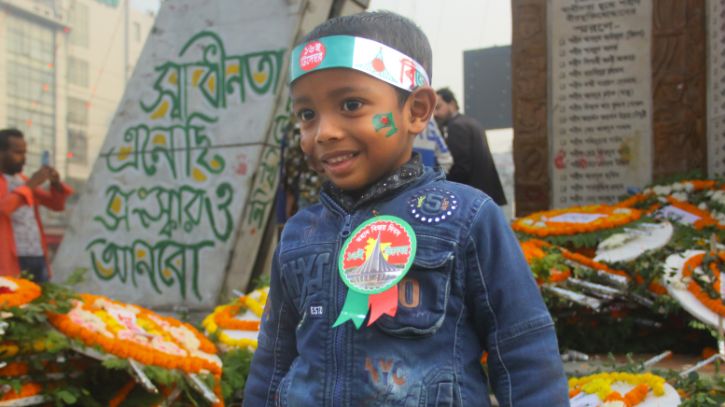 বাবার হাত ধরে শ্রদ্ধা জানাতে বিজয় স্তম্ভের দিকে এগিয়ে যাচ্ছে শিশুটি।
